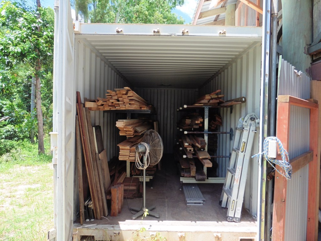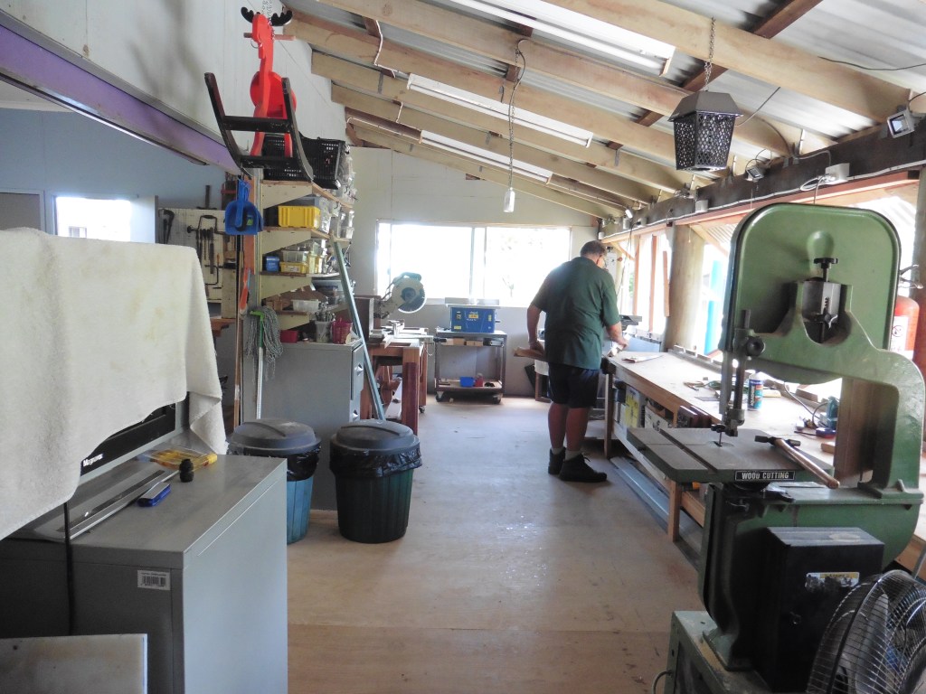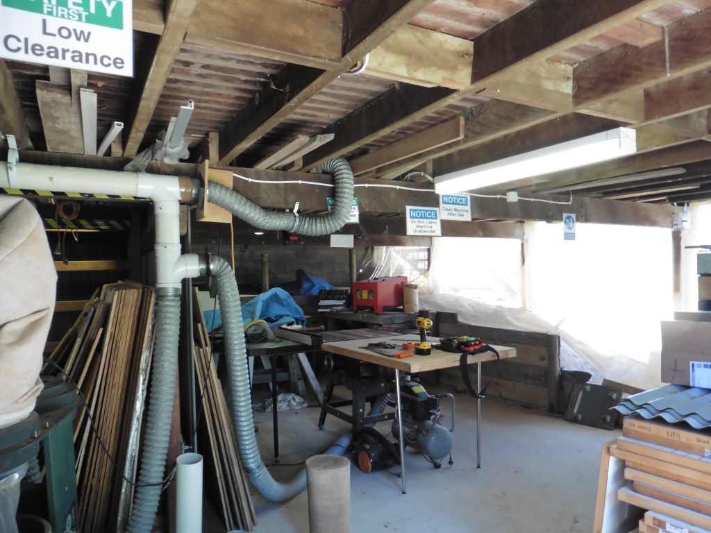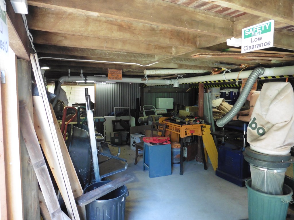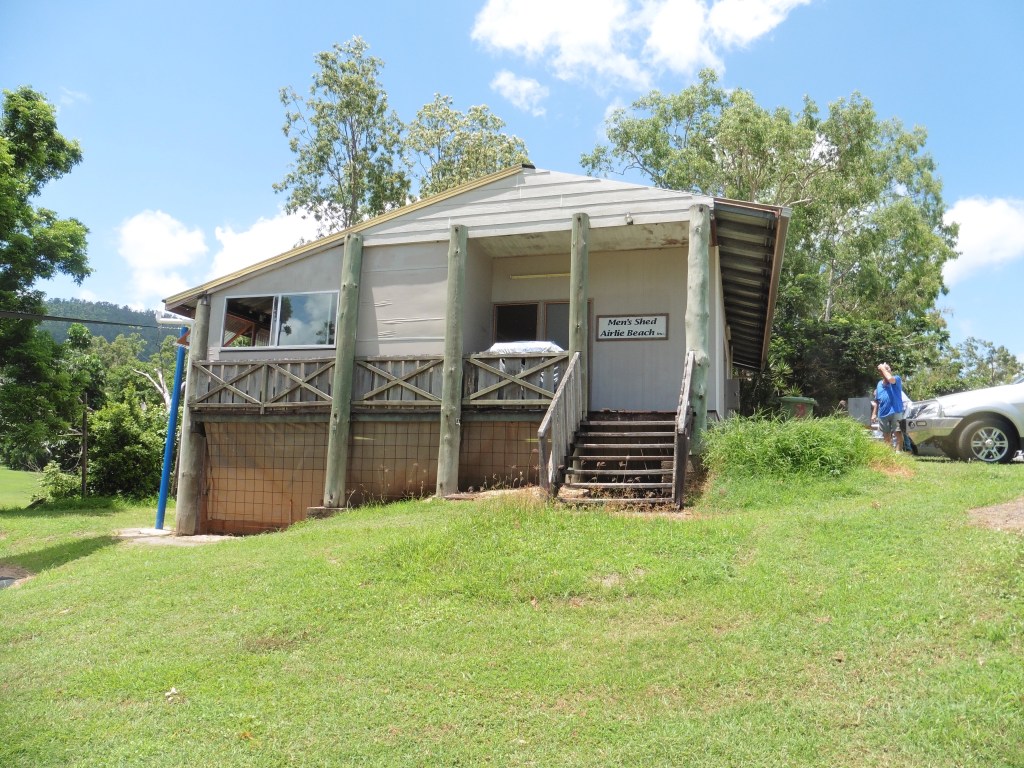 Airley Beach Men’s Shed. The old Boy Scout’s Hut.Side view of building showing the length. Entrance to the working space under the Shed and storage container. Note, the enclosed old veranda.Underneath workshop, showing the sawdust extraction ducting and equipment.Dry storage for timber.Upper workshop and Mess area.Store RoomWorkshop created on the old verandaWood Turning Lathes in separate workshop.