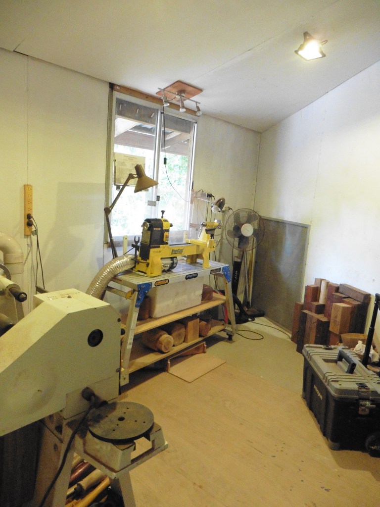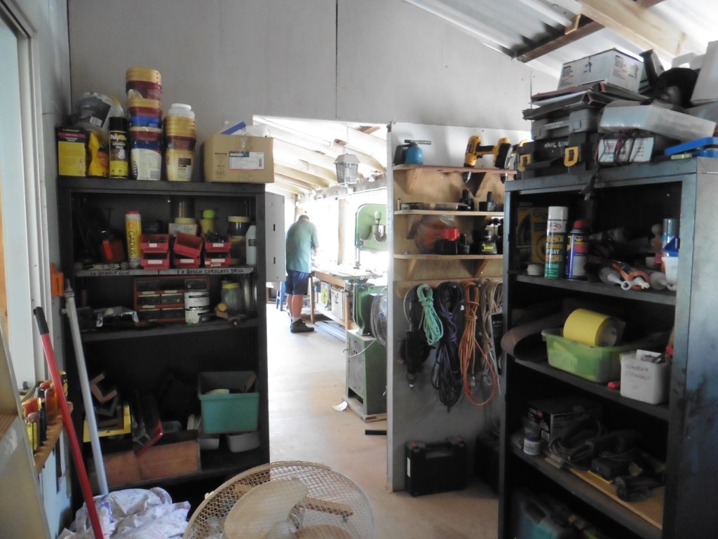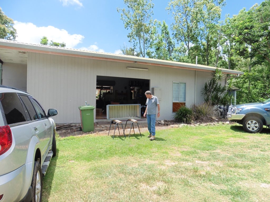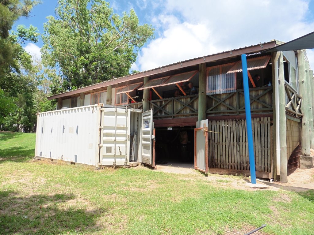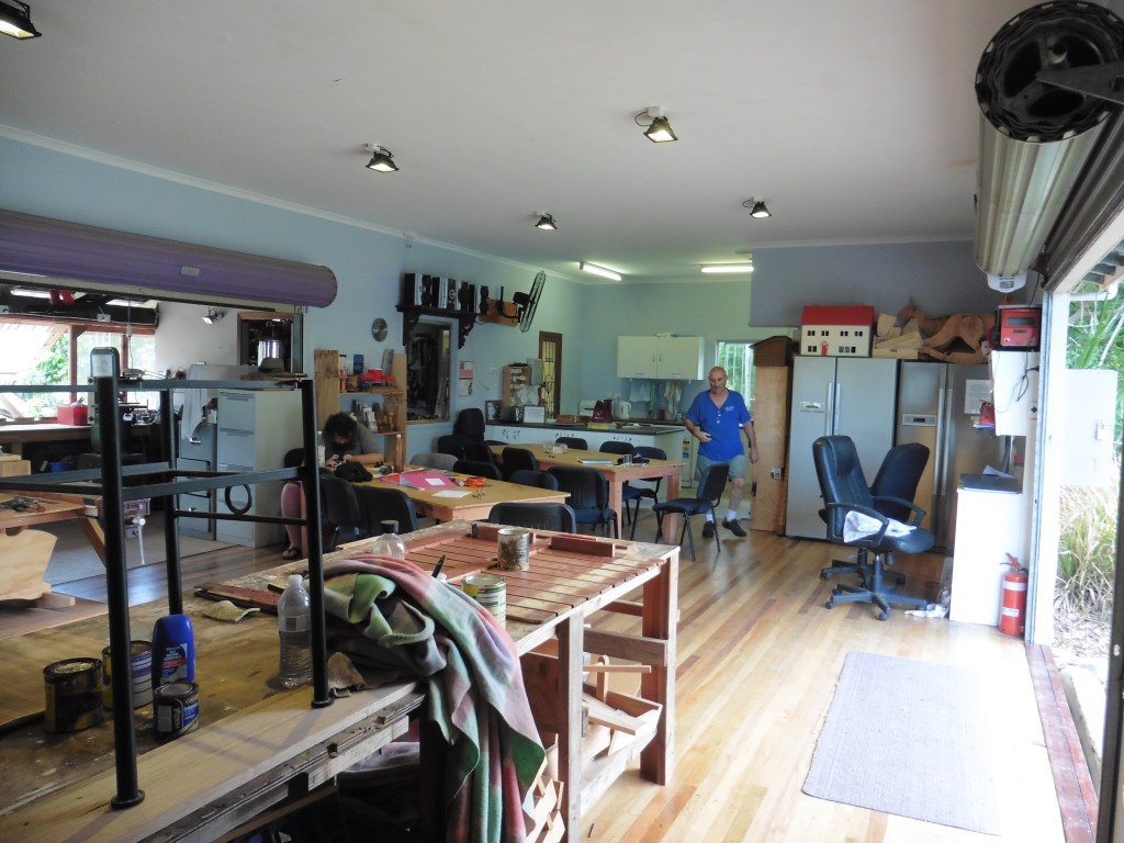 Airley Beach Men’s Shed. The old Boy Scout’s Hut.Side view of building showing the length. Entrance to the working space under the Shed and storage container. Note, the enclosed old veranda.Underneath workshop, showing the sawdust extraction ducting and equipment.Dry storage for timber.Upper workshop and Mess area.Store RoomWorkshop created on the old verandaWood Turning Lathes in separate workshop.